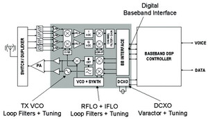 今日的单芯片收发器是集成度很高的组件,它集成了所有的压控振荡器 (VCO)、频率合成器以及接收机和发射机电路。集成多数或全部的压控振荡器正逐渐成为一项标准特色,然而回路滤波器的集成通常却很困难,因为约1MHz的截止频率可能需要很大的片上电容。如果采用外部实现方式,回路滤波器通常也需要高精度的薄膜电容,它们可能造成用料成本大增。调谐元件的集成也很困难,因为它们的损耗必须很低,才能将压控振荡器的相位噪声减至最小。集成回路滤波器和调谐元件可以屏蔽本地振荡器,使其不受外部干扰源的影响,进而改善接收线度和发射机的相位误差。