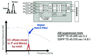 随着数据速率不断增加,射频收发器和基带处理器的系统最佳化就成为提高性能的最重要方法,例如直流偏移电压在手机无线电中就有许多可能来源,包括电路固有的直流偏移、本地振荡器或是基准时钟谐波的自混波、以及阻隔器所导致的二阶非线性现象。有些偏移电压源很容易在校准程序中检测,并加以抵消,它们对于性能的影响也微不足道。但由阻隔器产生的直流偏移电压就很难检测,并可能造成接收灵敏度或自动增益控制回路性能大幅下降。EDGE和WCDMA所采用的阻隔器都是振幅调制,这使得软件校准变得非常困难。