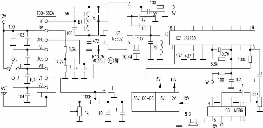 3?第二中放、音频解调选用高信噪比的FM/AM收音机集成电路LA1260。该集成电路包含AM/FM两部分,本机取其FM部分,AM部分空置,LA1260有很高的信噪比,FM部分为81dB,比常用集成电路(CXA1019、CXA1238、TTA8127)高11dB,具有失真小、抗干扰能力强等优点。