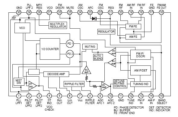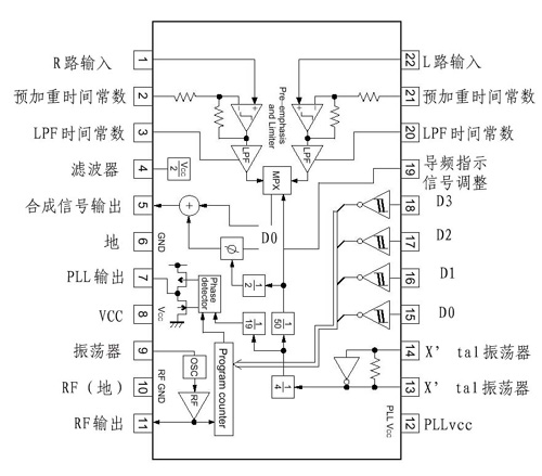 接收电路采用的是sony公司的高品质调频立体声接收芯片CXA1238M,其引脚功能如下图所示: