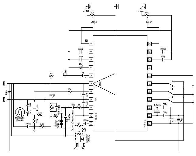 发射装置采用ROHM公司的单片数字锁相立体声调制芯片BH1416F,该芯片性能卓越,失真仅为0.5%,声道分离度高达40dB,传送的音质可