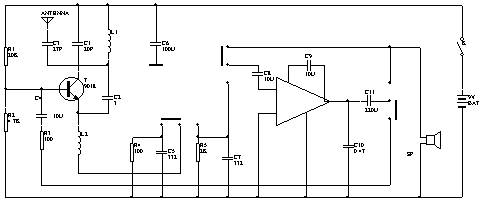 电路如图所示。三极管V和电感线圈L1、电容器C1、C2等组成电容三点式振荡电路,产生频率约为100MHz的载频信号。集成功放电路LM386和电容器C8、C9、C10、Cll等组成低频放大电路。扬声器BL兼作话筒使用。电路工作在接收状态时,将收/发转换开关置于“接收”位置,从天线ANT接收到的信号经三极管V、电感线圈L1、电容器C1、C2及高频阻流圈L2等组成的超再生检波电路进行检波。检波后的音频信号,经电容器C8耦合到低频放大器的输入端,经放大后由电容器Cll耦合推动扬声器BL发声。
