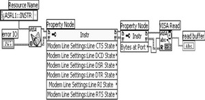 LabVIEW平台下开发调制解调器通讯程序一般使用AT命令和虚拟仪器VISA接口较为方便,编制的程序较为灵活。AT命令建立调制解调器之间的连接,计算机通过串口VISA特性获得调制解调器线路状态和与之交换数据,图2是计算机通过COM1(ASRL1::INSTR)获得调制解调器的线路CTS、DCD、DSR等状态和读取串口所存在字节的框图程序。