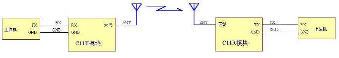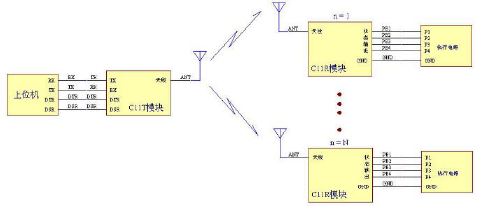 一发一收的应用模式在下面的领域中有广泛应用。其一是可视的遥控及有其他的反馈途径的的遥控领域。如天车遥控,机器人控制、可视监控系统的云台控制等。其二是:单向发送的各种状态数据的传输。如高炉温度、衡器的称重重量、气球上的气象参数采集等。连接关系见图1。
