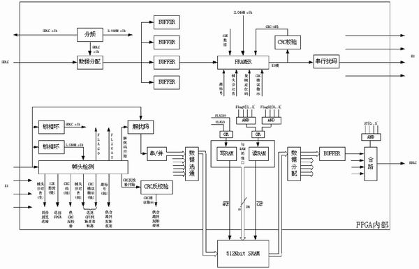 考虑到系统要能实现将一路N×64Kbps的HDLC数据按比特分接在M路E1信道中独立传输,并在接收端通过合路正确恢复出此数据,合路过程要求M路E1信号完全同步,而实际线路中各路之间有不同程度的延迟,这就要求系统具有延时缓冲能力。在此期间利用一个存储器对数据进行缓冲保存。而为了辨别某一路保存在SRAM中的CRC复帧应该和其它路保存在SRAM中的相应CRC复帧合路,即为了实现复帧同步,就需要对每一个CRC复帧加上标号,也就是加上复帧定位码。此外,由于HDLC数据是按比特分接在M路E1信道中传输的,当M=2,3,4时,那么在接收端就必须按照发送时分接的顺序将M路E1信道中的信息位按比特复接成HDLC数据。所以各路E1都需要一个代表分/复接顺序的路标号。为了充分利用E1信道资源 ,利用E1奇帧帧头后三个备用比特为用户提供一个12Kbps的同步数据通道,也可以作为低速的异步数据通道,如常用的2400、4800、9600bps的RS-232信号。
