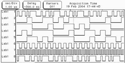 对整个系统和每个子模块都进行了功能仿真和后仿真。功能仿真平台为ModelSim + 5.5f ,综合平台为FPGA Express 3.5,后仿真平台为Altera Quartus3.0。用逻辑分析仪HP54645D实测波形如图1所示(取M=4,N=104)。