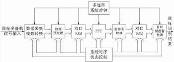 众所周知,雷达信号处理要求信号处理机具有对大批量数据的高速处理能力、强杂波环境下正确识别目标的能力。对某种用于探测近距离运动目标的雷达系统来说,数字信号处理的任务,是要实现对回波的A/D变换、数据预处理和缓冲积累、时-频域变换、坐标系转换、时域-频域目标信号检测和目标运动参数(如速度)的提取。