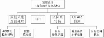 近距雷达目标检测信号处理机顶层由主状态机控制,主状态机响应雷达系统的指令,完成对各个分状态机的调度;数据采集预处理、FFT、坐标系转换和CFAR检测这四个分状态机又分别控制各自的下层子状态机动作,从而完成数据的采集、模数转换、时域预处理、频谱分析、坐标系转换、目标谱线识别和CFRA检测等一系列处理任务。