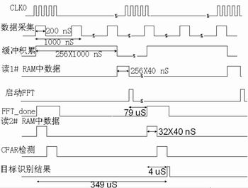 在近距雷达数字信号处理的FPGA方案开发过程中,利用目前最优秀的HDL仿真软件ModelSim5.6编译和仿真Verilog HDL程序代码;利用LeonardoSpectrum2002对设计进行综合优化;利用QUARTUS II进行布局布线,并基于一片10万门规模的FPGA-ACEX1K100完成设计。图3为信号处理主状态机控制下个处理单元的时序关系。