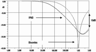 对于IPAD技术,倒装芯片封装的性能最好。典型倒装芯片封装的内在寄生电感为每块0.20nH,比SOT塑料封装每个引线的0.40nH小很多。这种减小寄生电感对滤波性能的作用见图3。衰减增益与SOT-323封装比较约为15%。