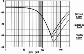 图3还说明,SOT-23封装的寄生电感值为每个引线0.55nH时滤波性能在800MHz时为-20dB。而对于倒装芯片封装,同频率的滤波响应为-28dB,性能提高大约25%。
