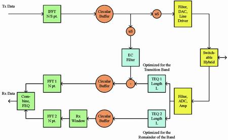 对于长环路中各种干扰的补偿,根据通道不同部分上观测到的ISI可采用两条路径。EC可用于专为过渡带(这是回波最多的地方)设计的路径,而降低RFI的接收机窗口或TEQ设计可用于另一路径,因为上述干扰会出现在过渡带以外(见图1)。