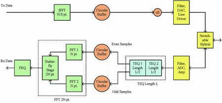 图2 针对短环路(ADSL2+)进行优化的调制解调器架构。请注意,针对长环路进行优化的调制解调器的两条路径相结合,就构成了TEQ与FFT操作