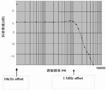 对电性能而言最为重要的是由相位检波器、误差放大器、电荷泵以及环路滤波器所构成的串联元件组。对于一个输入基准时钟信号,这些元件起一个二阶低通滤波器的作用。图2示出了抖动和频率转移函数以及在本例中所使用器件的带宽响应。