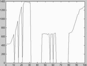 在进行数据采集时会在连续的数据中出现零值点,出现零值点有两种可能:一种是正常书写时笔划的改变造成的,另一种就是由于触摸屏不够平整或是书写时的抖动造成笔迹的间断而造成的,区别的方法主要是看间断时间也就是零值连续出现的个数,一般抖动造成的间断时间小于设定的采样时间10ms,所以,抖动产生的零值在两个有效数据中间只能出现一个,可以认为是无效零值,而出现两个以上的连续零值便可以认为是笔划的改变而生成的有效零值而不作处理,当判断出某个零值为无效零值后,对其进行线性内插来弥补数据的丢失,即an=(an+1+an-1)/2,其中an是无效零值点,an-1和an+1分别是an的前面和后面的一个有效值。图3和图4分别是处理前和处理后的波形。