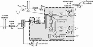 在零中频接收机中,2阶互调分量(IM2)是一个干扰源,而必须使接收机基带通道中的这些成分最小。在零中频接收机中,前端2阶非线性解调调幅信号后,阻差分量落入基带内。由于这些2阶IM2分量是由阻塞包络的平方项组成的,所以基带中这些不希望的频谱分量的带宽可能达到阻塞振幅包络带宽的2倍。IM2分量依赖于基带中所希望的信号调制带宽,所以这些IM2分量将部分地或全部导致接收机干扰容限。