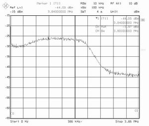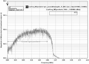 在图5和图6中分别示出WCDMA UL参考测量信道(12.2kbps)和WCDMA DL 16信道阻塞在零中频下变频器基带输出的仿真IM2分量频谱。在ADS模板中,为了仿真,用0dBm的调制阻塞功率和等于+30dBm的零中频下变频器IIP2。对于0dBm WCDMA UL发送信号在1KHz...2.06MHz所希望的信号通带内积分,得到总的低频IM2分量的功率等于-43.7dBm。2阶非线性所引起的DC偏移为5mV,这等效于50Ω上产生-33dBm(图5)。另外,对于0dBm WCDMA DL 16信道阻塞的总IM2分量的功率电平,在1KHz...2.06MHz所希望信号通带内积分等于-33.1dBm。2阶非线性引起的总DC偏移等于5mV(图6)。根据方程6,假定在零中频下变频器输入端双音阻塞总功率电平为0,则接收器输入的总IM2分量的功率电平计算如下 :