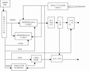 现代雷达对频率合成器相位噪声、快速捷变能力、灵活多变的波形产生、带内杂散提出越来越高的要求。全相参直接式频率合成器具有较高的频率稳定度,短的跳频时间,直接式频率合成器的缺点是杂散抑制,而且设备量庞大。锁相频率合成器的缺点在于如果环路总分频比太大,会严重恶化输出的相位噪声;且频率变换速度较慢。所以将直接倍频与数字锁相结合,利用开关的快速切换速度、直接倍频的频率稳定性、数字锁相的灵活多变,完成方案的设计。
