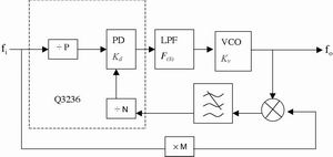 对于工作频率高、变频间隔相对较小的锁相合成器,如果采用前置分频法,则环路分频比较大。在反馈支路进行频率下移,可有效减小环路分频比,有利于改善系统的相位噪声和动态相应特性,这是目前常用的一种锁相合成器。工作原理是参考信号与反馈信号在PD中进行相位比较,输出电压通过环路滤波器LPF抑制噪声和高频分量来控制VCO,系统通过控制反馈支路移频后的分频比,实现捷变频,环路锁定时,输出频率为f0=(m+N/p)fi。其框图如图2所示。