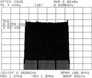 按照图1所示框图完成的X波段频率合成器本振路单边带相位噪声功率谱密度曲线(fo=9500MHz)如图5所示,发射路带宽为50MHz线性调频信号波形如图6所示。