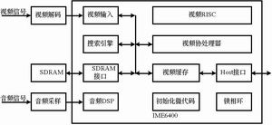 IME6400是InTime公司的同时支持MPEG1/2/4三种视频编码标准的硬件音视频编码压缩芯片,芯片内部带有图像压缩硬核,外挂8M字节SDRAM配合工作,与流行的MPEG4软件编码的不同之处在于输出视频流的画面可达720X480@30fps或者720X576@25fps,是通用DSP芯片软件算法编码画面的4倍。该芯片的内部框图如图2所示。