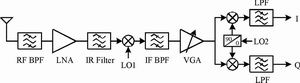 超外差(Super Heterodyne)体系结构自1917年由Armstrong发明以来,已被广泛采用。图1为超外差接收机结构框图。在此结构中,由天线接收的射频信号先经过射频带通滤波器(RF BPF)、低噪声放大器(LNA)和镜像干扰抑制滤波器(IR Filter)后,进行第一次下变频,产生固定频率的中频(IF)信号。然后,中频信号经过中频带通滤波器(IF BPF)将邻近的频道信号去除,再进行第二次下变频得到所需的基带信号。低噪声放大器(LNA)前的射频带通滤波器衰减了带外信号和镜像干扰。第一次下变频之前的镜像干扰抑制滤波器用来抑制镜像干扰,将其衰减到可接受的水平。使用可调的本地振荡器(LO1),全部频谱被下变频到一个固定的中频。下变频后的中频带通滤波器用来选择信道,称为信道选择滤波器。此滤波器在确定接收机的选择性和灵敏度方面起着非常重要的作用。第二下变频是正交的,以产生同相(I)和正交(Q)两路基带信号。