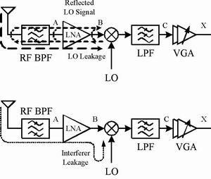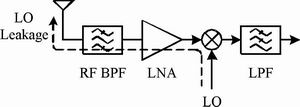 零中频结构的本振频率与信号频率相同,如果混频器的本振口与射频口之间的隔离性能不好,本振信号就很容易从混频器的射频口输出,再通过低噪声放大器泄漏到天线,辐射到空间,形成对邻道的干扰,图3给出了本振泄漏示意图。本振泄漏在超外差式接收机中不容易发生,因为本振频率和信号频率相差很大,一般本振频率都落在前级滤波器的频带以外。
