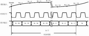 ADS5500是一款低功耗、采样率为125MSPS的14位流水线模数转换器,仅需一个3.3V的单极性电源就可正常工作。数据转换过程启动于时钟信号波形的上升沿,一旦模拟信号被转换器的采样/保持部分捕获后,输入信号的采样过程被依序分割为一系列的流水线操作,使时钟信号的上升沿和下降沿都能进行数据的转换工作。从输入模拟信号到输出14位的数据需要16个时钟周期的延迟。图2给出了ADS5500输入、输出信号和时钟波形的对应时序。