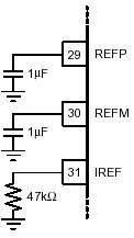 ADS5500的内基准电压源简化了电路板的电路布局,对此,板上可不用其它附加电路。但从优化性能的角度考虑,可在REFP和REFM引脚上各连接1个1mF的电容器并接地。此外,为更好设置芯片的工作电流,还应在IREF引脚上连接1个47Ω的电阻,并与AGND引脚相连(图4)。