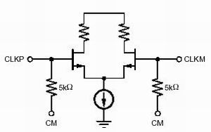 芯片的时钟输入信号可以是单极性或差分信号,普通模式下,时钟输入信号的电压幅值设置为1.5V,CLKP引脚、CLKM引脚各通过5kΩ电阻与CM引脚相连(图5)。