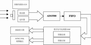 图6是一个实时图像处理系统,CCD传感器把原始图像(模拟信号)送至ADS5500高频采样,得到高精度的数字图像信号,再通过高速同步FIFO送入到图像处理单元,由数字信号处理器完成图像的处理和压缩,并将处理后的数据显示在液晶显示器或CRT显示器上。