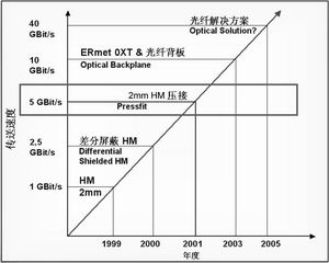 如果传送速度在1Gbps左右,你还可用2mm硬公制连接器;若在2.5Gbps应用的话,连接器还可用差分屏蔽的2mm的产品;但若传输到5Gbps时,就要用专门的2mm硬公制压接式的连接器;如果要到10Gbps,就要用到诸如ERNI公司的ERmet 0XT或光纤背板等方案了;40Gbps要用光纤解决方案(图1)。