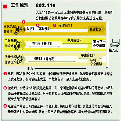 802.11e是IEEE推出的无线通用标准,它使企业、家庭和公共场所(如机场、饭店等)之间真正实现互通,而同时具有满足不同行业特殊需求的特性。与其他无线标准所不同的是,该标准在MAC物理层增加了服务质量(QoS)和对现有的802.11b和802.11a无线标准提供多媒体支持,同时完全与这些标准向后兼容。