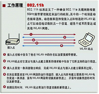 钟爱802.11标准大餐的朋友,也许对802.11h感兴趣。原因在于它能克服现有的其他802.11标准的缺陷。我们知道,802.11a无线网络工作在5GHz频段,支持多达24个不重叠的信道,对干扰的敏感性也比802.11g低,但因国家不同,利用5GHz频段的环境会发生改变,同样会遇到与其他系统相互干扰的问题。802.11h针对这个问题所定义的机制能使基于802.11a的无线系统避免与雷达和其他同类系统中的宽带技术相干扰,保障无线通信的畅通。