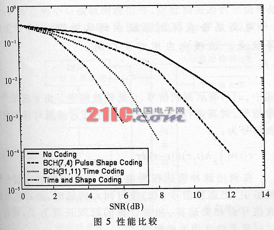 传输效率的提高带来系统性能的下降,这是许多系统所不能容忍的,因此需要进行编码。首先在形域采用BCH(7,4)对信号编码,这样一来传输速率是单脉冲的4倍,而误码性能则与单脉冲基本相同,随后在时域对信息帧进行BCH(31,11)编码,使性能进一步提高,最后还可以在时域和形域联合编码,误码性能会得到大幅度的改善,而传输效率仍然高于单脉冲系统。性能曲线如图5所示。