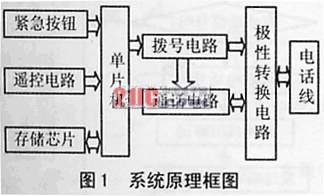该系统以单片机为核心,由DTMF拨号电路、遥控发射及接收电路、电话号码存储电路和免提通话电路四部分组成。当有险情发生时,按下呼叫器或遥控器上的紧急按钮,单片机检测到该信号后,将 存储的电路号码发送出去,接通后可以实现提对讲。此外,由于该系统中的电话号码是存储在一片带I2C总线接口的E2PROM芯片中,所以该号码可以随时修改,极其方便。系统原理框图如图1所示。