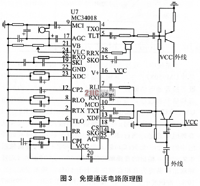 免提通话电路要求做到声音清晰、洪亮,又不会因受话、送话而相互干扰。因此,对免提通话电路的技术要求较高,送话放大器灵敏度要高;受话放大器输出功率要大;能有效地抑制受话引起的侧音效应。本系统采用专用免提通话芯片MC34018来构成免提通话电路。