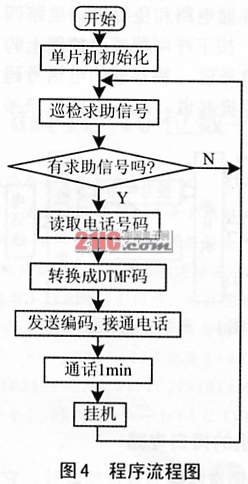 在单片机完成复位和初始化后,当有求助信号输入时,单片机将所存储的电话号码取出并发送给UM95087芯片,使电话接通,完成通话对讲功能。其程序流程框如图4所示。