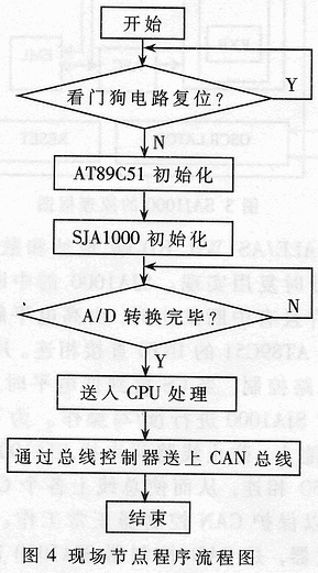 根据系统的工作要求,工作重点包括CAN总线通信程序、看门狗的初始化、A/D采样控制程序、执行机构控制程序和控制算法等,主要流程如图4所示。限于篇幅,这里着重介绍SJA1000初始化程序设计、发送程序设计、接收程序设计以及A/D转换程序的设计。