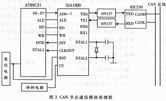 控制单元以8位单片机AT89C51为核心,选用器件SJA1000作为CAN控制器,并选用芯片82C250和6N137作为CAN控制器接口和光耦隔离。硬件电路如图2所示。