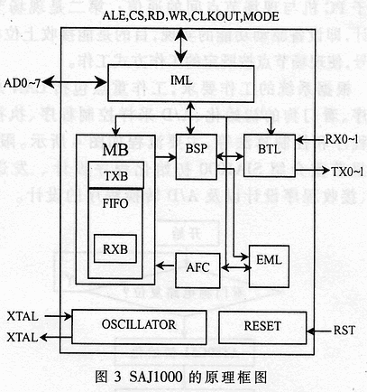 系统采用的CAN总线通信控制器SJA1000是PHILIPS公司生产的一种独立式CAN器件,其原理框图如图3所示。它与CAN2.OB相兼容[1],同时支持11位(BasicCAN模式)和29位(PeliCAN模式)识别码。