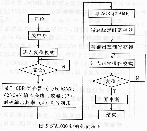 初始化流程图如图5所示。AT89C51上电或复位后,调用复位程序给SJA1000的复位端(RST)提供复位信号,使SJA1000进入复位模式。SJA1000的初始化只有在复位模式下才可以进行。初始化程序主要完成以下寄存器的设计:(1)通过对SJA1000的时钟分频寄存器定义,判断是使用BassicCAN模式还是使用PeliCAN模式;是否使能CLOCKOUT及输出时钟频率;是否使用旁路CAN输入比较器;TX1输出是否采用专门的接收中断。(2)通过写验收码寄存器和验收屏蔽寄存器定义接收报文的验收码,以及对报文和验收码进行比较的相关位定义验收屏蔽码。(3)通过写总线定时寄存器定义总线的位速率、位周期内的采样点和一个位周期内的采样数量。(4)通过写输出寄存器定义CAN总线输出管脚TX0、TX1的输出模式和输出配置。(5)清除SJA1000的复位请求标志,进入正常工作模式,这样SJA1000方可进行报文的发送和接收。