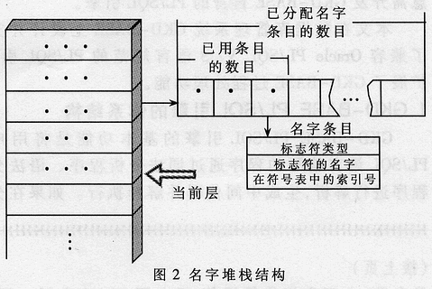 考虑到PL/SQL语言的块结构和名字作用域,可以使用名字堆栈存放源程序中所使用的标志符的索引、名字和类型。每个项目只包括名字本身和用来表明它的类型的标志值,以及该名字在符号表中的项目索引。名字堆栈采用层次结构,是链表型的堆栈,堆栈的每一层存放了解析的语句块嵌套层内的所有名字信息,如图2。在进入或退出一个嵌套层时调用相应的压栈和弹栈操作;查找符号时,从栈顶向栈底搜索。名字堆栈实现了标志符名称与相应的符号表索引间的映射,解决了标志符的作用域问题和可见性问题,满足了对符号表管理和调用的要求。