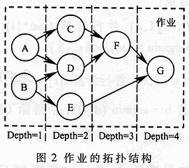 图2表示一个作业的拓扑结构。设该作业由标记为A~G的7个任务及其相互关系组成。如图2所示,任务D需要在任务A和B完成后才能开始,而任务G必须在任务正和F完成后才能开始。