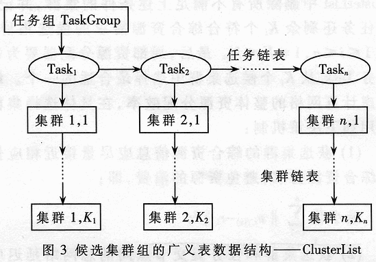 根据任务组中每个任务的静态需求,全局资源分配器在静态资源库中搜索满足需求的集群。在搜索时首先随机选择搜索的起始位置,然后为每个任务分别返回最先发现的N个满足该任务需求的集群,形成候选集群组,并以ClusterList数据结构描述后提交给局部资源分配器;其中ClusterList是用来描述候选集群组的广义表结构,如图3所示。对于任何一个任务,如果只找到K(