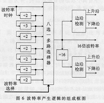 控制逻辑产生所需的所有波特率信号及对应的上升和下降沿指示信号,并根据实际工作所选择的波特率输出与系统时钟同步的对应信号。波特率产生逻辑的组成框图如图6所示。