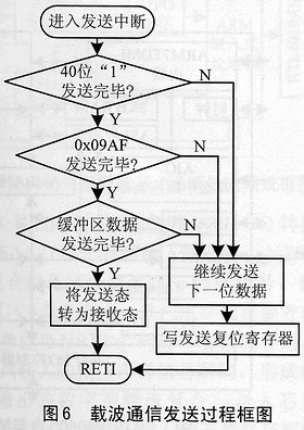 数据全部发送完成后,载波模块即可转入接收态。但为确保待发送数据的最后一个位发送成功,必须在发送完最后一位数据后等到下一次发送中断到来后,才可以转换载波发送态到接收态。