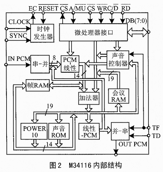 当系统组织一个电话会议时,参加会议的任一台话机接口的输出信号都必须同时送到其余所有话机接接收端。换而言之,会议中每一个接口的接收端所收到的信号就是除本身外其余所有话机接口输出的模拟话音信号的叠加。在数字交换中,由于话音信号的二进制非线性编码(A/μ律)特性,不允许将来自若干路接二进信号简单地相加。图2为M34116内部结构图。会议芯片须占用一对母线,交换网输出的PCM信号由芯片的PCM I愼脚输入,经串-并变换后,输入线性化电路。线性化后的各引时隙(抽样)加上控制系统端口的衰减或增益电平被送入加法器相加,加完后的结果通过POWER 10再线性化后送入帧RAM中。哪些时隙构成一个会议,由控制系统经数据总线中口写入。当一个接口发起一个会议时,控制系统为该会议编排一个1~29的编号。此后,其它接噪中根据需要加入已经存在会议,或重新组织另一个会议。控制系统由数据总线口将各会议的编号及参加每个会议的各时隙的编号写入会议RAM中,地加法器对各信号正确地组合相加。加法器输出的信号经非线性化电路还原为A/μ律编码信号,最后有并一串变换电路恢复为串行输出,送往对应的交换网络PCM输入总线。