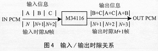 M34116是专为PCM数字交换应用而设计的器件,能汇接64方会议和最多29组会议。M34116与交换网络、微处理器连接中图3所法。交换网可以采用M3488或MT8980D等数字交换网络。经过PCM编码后,其输出时隙比输入时隙延时一个帧(加一个时隙),因此,做会议接续时应延时一个时隙。输入、输出关系如图4所示。M34116对每种工作模式的每一通道具有可编程衰减 或增益控制,输入/输出的范围均为±15dB。