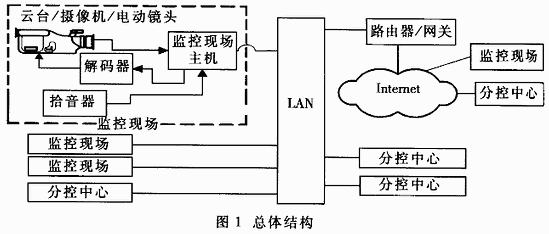 远程监控系统一般包括三部分:前端监控现场、通信设备和后端分控中心。整个系统基于Client/Server(客户机/服务器)模式。总体结构如图1所示。